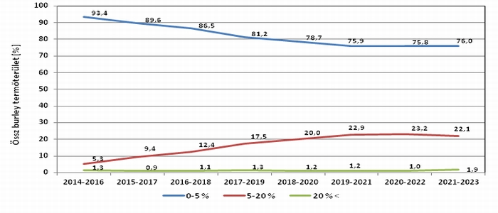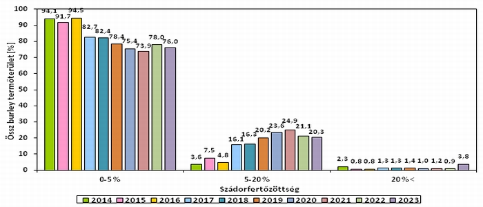 A burley esetében (2. ábra) a virginiához hasonló változás figyelhető meg a felvételezés tíz éve alatt. A kevésbé fertőzött területek részaránya magasabb értékről (94,1 %) indult 2014-ben, mint a virginia fajtacsoportban, 2023-ra viszont a virginiánál regisztrált szintre csökkent. Az 5-20%-os kategóriába sorolt terület növekedett a felmérés évei alatt, míg az erősen fertőzött területek részaránya kis mértékben ingadozott.