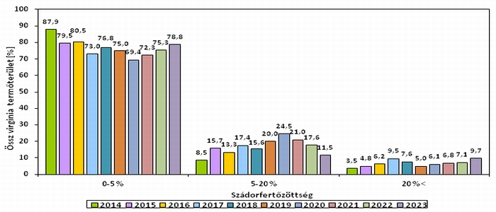 1. ábra Hazai virginia dohánytermő területek szádor fertőzöttsége, 2014-2023