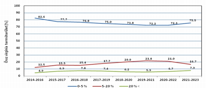 3. ábra Hazai virginia dohánytermő területek szádor fertőzöttségének hároméves mozgóátlaga, 2014-2023